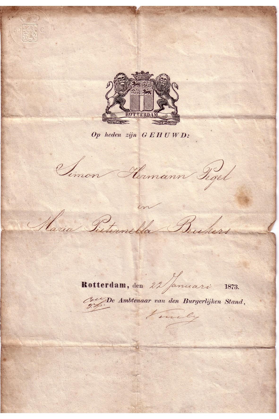 | 3. | m | Hendrikus, born circa 1868 in Rotterdam. Married on 31-12-1890 in Rotterdam to Maria Johanna PLEIJSIER, born circa 1870 in Rotterdam, daughter of Krijn PLEIJSIER and Anna Clasina LUTJENS. |