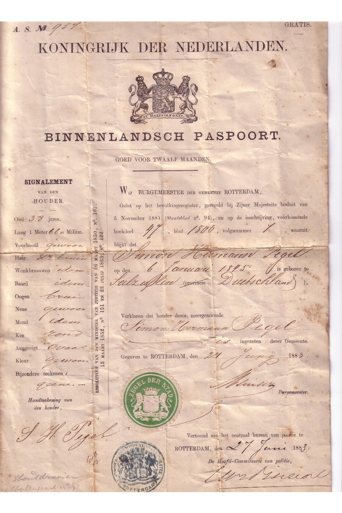 | 1. | m | Rudolf Hermann, Koopvaardijmatroos/Bootwerker, born on 04-06-1873 in Rotterdam (zh) (source: Gemeente Archief Rotterdam, Persoonskaart in het familiearchief aanwezig), died on 01-04-1969 in Zevenbergen (nb) at the age of 95 (source: Persoonskaart in het familiearchief aanwezig). Married at the age of 24 on 23-06-1897 in Rotterdam (zh) (source: Gemeente Archief Rotterdam, Persoonskaart in het familiearchief aanwezig) to Christiane Helene Auguste WEINREICH, 25 years old, born on 29-12-1871 in Iserlohn (dnw) Duitsland (source: Persoonskaart in het familiearchief aanwezig), died on 25-07-1953 in 's-Gravenhage (zh) at the age of 81 (source: Persoonskaart in het familiearchief aanwezig), daughter of Adam WEINREICH and Mina BRINKMANN. |